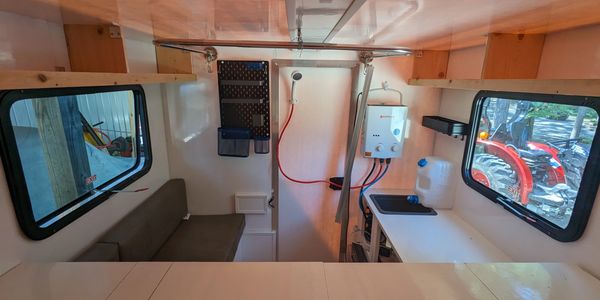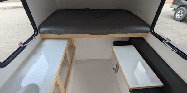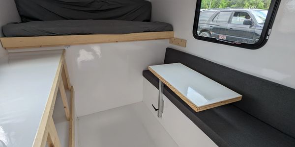 So many truck campers today feel cramped. I will admit this is hard to avoid when your camper fits in the bed of truck. However, we utilize the spacing in the camper efficiently. On one side is a sink and long countertop making food prep easier than the traditional two separate small countertops on opposite sides of the camper. Our counter also has a huge amount of tall and deep storage for your gear under it. On the other side of ours there is comfortable bench seat. This also leaves the floor open which allows you to fill it with gear or toys you're going to unload as soon as you get to the campsite. The table is adjustable, so it swivels to get out of the way when needed and also has several other adjustments. You can also easily remove it if needed also.